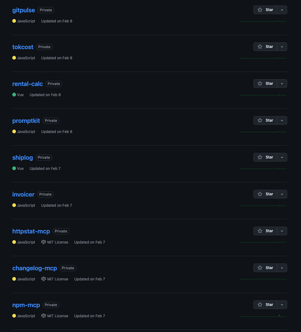 Explore mode — the original mode, and the whole point. The agent reads an interests file (areas like AI tooling, developer productivity, small SaaS ideas, real estate tools, etc.) and riffs. It generates ideas, picks one, and builds a rough prototype. Over the course of a few weeks, it spun up around 20 different projects — some interesting, some useless, a few genuinely surprising. It manages its own status, picks up where it left off, and rotates across interest areas. It's like having a junior dev with endless curiosity and zero focus — which is exactly what you want for idea generation.