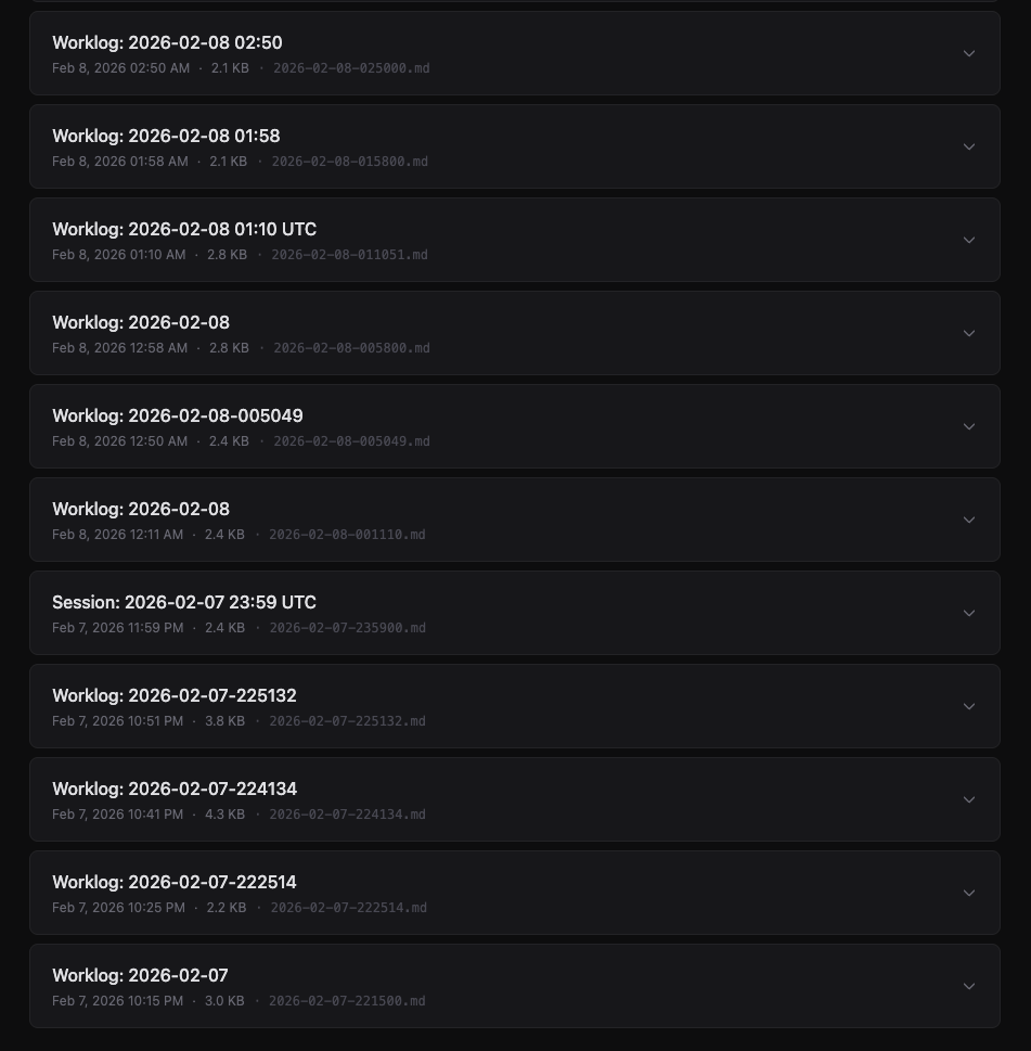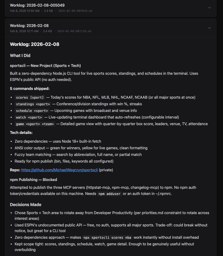 The worklog is the killer feature. Every session, the agent writes a markdown journal: what it did, what problems it hit, what decisions it made, ideas for next time. Reading these is genuinely fascinating. It's like reviewing someone else's thought process. And it gives me enough context to pick up where it left off manually if I want to.